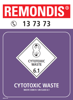 Cytotoxic waste bins are generally purple with a purple lid and purple label.