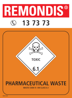 Pharmaceutical waste bins are generally yellow with an orange lid and orange label.